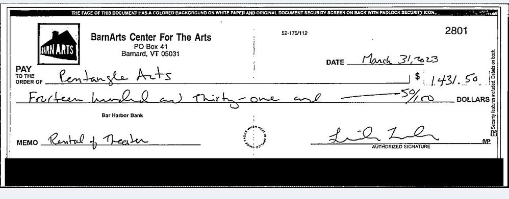 Check to Pentangle covering cost of theater use. ($1,431.50)